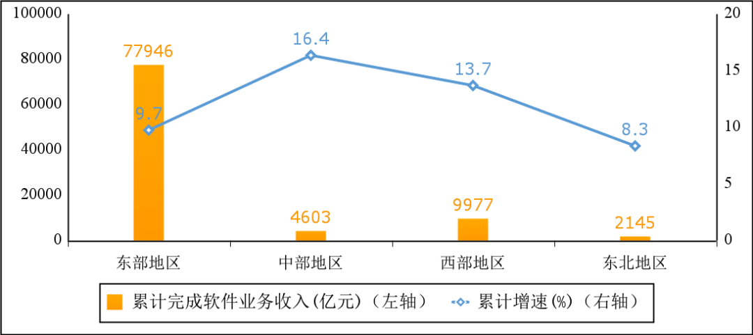 東部地區(qū)軟件業(yè)務(wù)收入加快增長(zhǎng),中部地區(qū)增勢(shì)領(lǐng)先。1—11月份,東部地區(qū)完成軟件業(yè)務(wù)收入77946億元,同比增長(zhǎng)9.7%,增速較1—10月提高0.3個(gè)百分點(diǎn);中部地區(qū)完成軟件業(yè)務(wù)收入4603億元,同比增長(zhǎng)16.4%,高出全行業(yè)整體水平6個(gè)百分點(diǎn);西部地區(qū)完成軟件業(yè)務(wù)收入9977億元,同比增長(zhǎng)13.7%,高出全行業(yè)整體水平3.3個(gè)百分點(diǎn);東北地區(qū)完成軟件業(yè)務(wù)收入2145億元,同比增長(zhǎng)8.3%,增速較1—10月回落0.2個(gè)百分點(diǎn)。四個(gè)地區(qū)軟件業(yè)務(wù)收入在全國(guó)總收入中的占比分別為82.3%、4.9%、10.5%和2.3%。