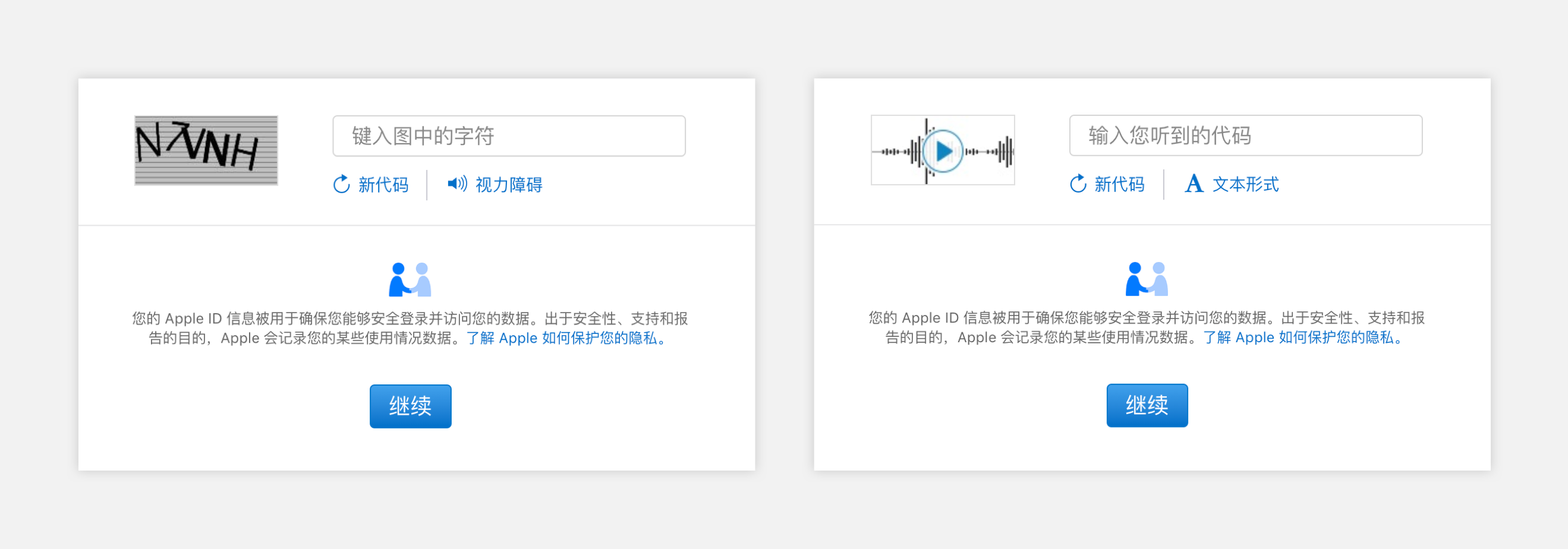 賬號(hào)注冊(cè)是用戶開(kāi)始業(yè)務(wù)辦理的第一步,可是往往這一步就給了視障人士一個(gè)很大阻力。目前很多政務(wù)服務(wù)網(wǎng)注冊(cè)流程的驗(yàn)證方式都只提供圖形驗(yàn)證碼,但屏幕閱讀器是無(wú)法識(shí)別驗(yàn)證碼中的文本信息。如果注冊(cè)流程都有障礙的話,其他業(yè)務(wù)辦理即使有做無(wú)障礙改造,對(duì)視障人士來(lái)說(shuō)都是沒(méi)有意義的。我們除了圖形驗(yàn)證碼之外,還應(yīng)該提供多種驗(yàn)證方式讓用戶選擇,如手機(jī)驗(yàn)證碼、語(yǔ)音驗(yàn)證碼等。蘋果網(wǎng)站的注冊(cè)流程中,驗(yàn)證方式除了提供圖形驗(yàn)證碼之外,還會(huì)提供語(yǔ)音驗(yàn)證碼。