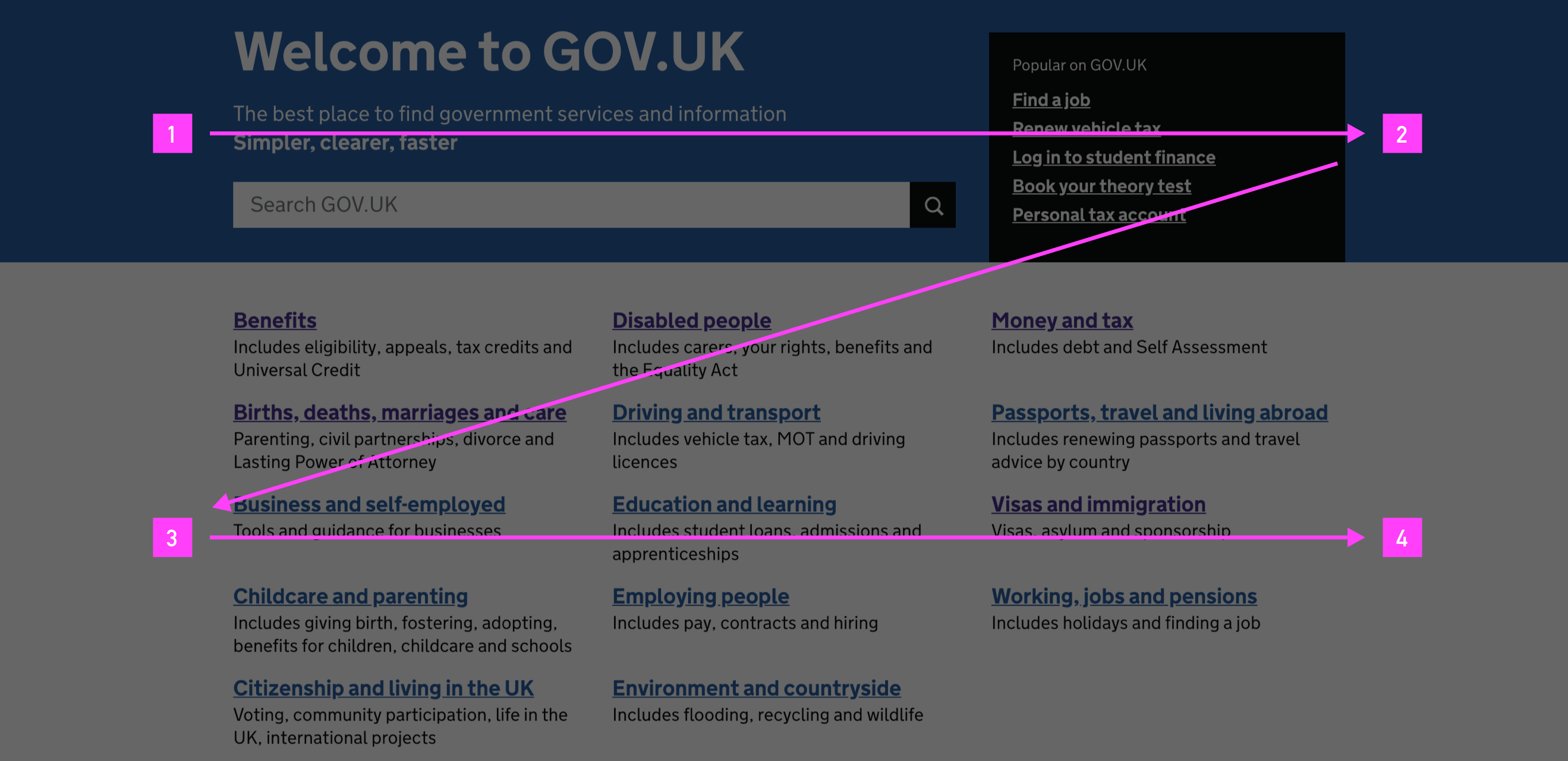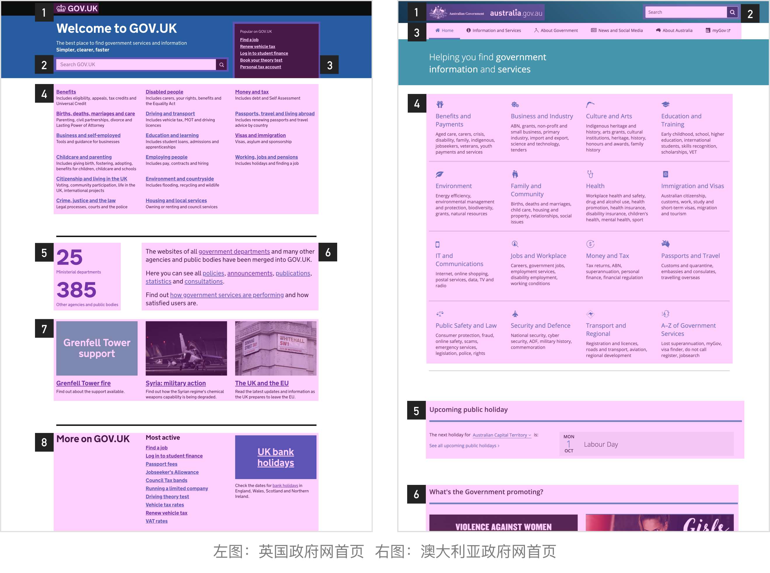 網(wǎng)站支持鍵盤導(dǎo)航是無(wú)障礙很最關(guān)鍵的一個(gè)方面,無(wú)障礙指南中提到要使所有功能都能通過(guò)鍵盤來(lái)操作,對(duì)于依賴于屏幕閱讀器的失明人士和沒(méi)有精確肌肉控制的人士,都需要使用鍵盤來(lái)導(dǎo)航內(nèi)容。 當(dāng)你瀏覽網(wǎng)站時(shí),整個(gè)頁(yè)面導(dǎo)航順序應(yīng)該是有邏輯,可預(yù)測(cè)和直觀的。選項(xiàng)的順序應(yīng)該遵循規(guī)則:從左到右,從上到下,由頂部導(dǎo)航到內(nèi)容內(nèi)容區(qū),最后是頁(yè)腳。 我們可以嘗試只用鍵盤操作來(lái)測(cè)試網(wǎng)站,使用 Tab 鍵移動(dòng)焦點(diǎn),用 Enter 鍵選擇元素。測(cè)試所有的交互元素是否可預(yù)測(cè)且有序。如果可以在沒(méi)有鼠標(biāo)的情況下瀏覽整個(gè)網(wǎng)站的所有內(nèi)容,證明這個(gè)網(wǎng)站已經(jīng)滿足了支持鍵盤導(dǎo)航的基本要求。 下圖是國(guó)內(nèi)某個(gè)政務(wù)網(wǎng)站首頁(yè)的導(dǎo)航區(qū),標(biāo)注的數(shù)字是獲取焦點(diǎn)的順序,在用鍵盤導(dǎo)航的過(guò)程中,整個(gè)頁(yè)面導(dǎo)航順序都比較混亂,某些元素也無(wú)法通過(guò)鍵盤來(lái)獲取。相反,英國(guó)政府網(wǎng)和澳大利亞政府網(wǎng)首頁(yè)的導(dǎo)航邏輯就會(huì)比較清晰,整個(gè)網(wǎng)站遵循從左到右,從上到下的原則,每個(gè)交互元素都可以通過(guò)鍵盤來(lái)獲取,讓用戶感知到整個(gè)網(wǎng)站的布局,確定每個(gè)內(nèi)容的位置。用戶通過(guò) Tab 鍵導(dǎo)航網(wǎng)站交互元素時(shí),焦點(diǎn)就是提供了當(dāng)前所選組件的可視化指示,焦點(diǎn)可幫助用戶了解界面上哪些元素有鍵盤焦點(diǎn),并幫助他們了解導(dǎo)航網(wǎng)站時(shí)的位置。很多網(wǎng)站都是用了瀏覽器默認(rèn)的焦點(diǎn)樣式,但我們也可以根據(jù)內(nèi)容設(shè)計(jì)出符合網(wǎng)站風(fēng)格,與品牌相呼應(yīng)的焦點(diǎn)樣式。 英國(guó)政府網(wǎng)就是重新設(shè)計(jì)了焦點(diǎn)樣式,使用黃色來(lái)突出焦點(diǎn),讓用戶更明確當(dāng)前焦點(diǎn)所在位置。根據(jù)不同的元素,樣式也會(huì)有所變化。蘋果官網(wǎng)的焦點(diǎn)樣式也進(jìn)行了重新設(shè)計(jì),在圓角輸入框上焦點(diǎn)也做了相應(yīng)的調(diào)整,使焦點(diǎn)和頁(yè)面元素更為融合。