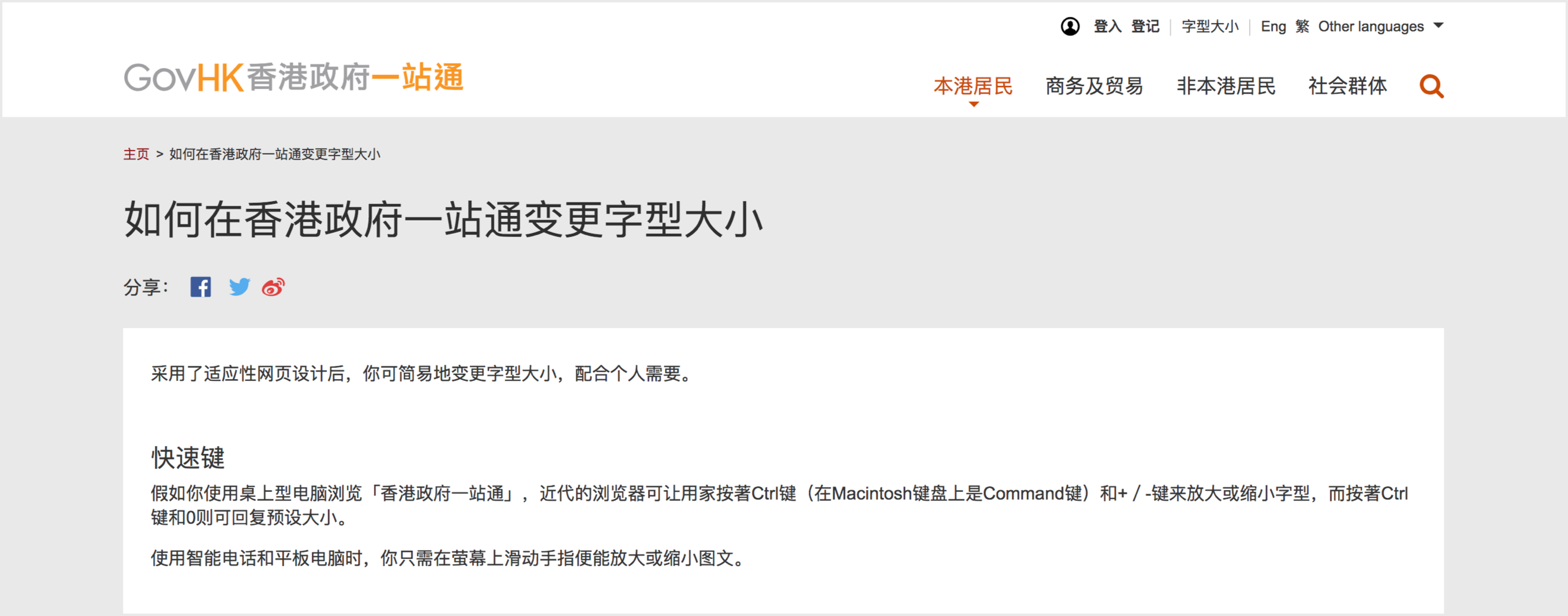 為了確保老年人用戶能清晰瀏覽網(wǎng)站,而且考慮到并不是每個(gè)用戶都使用高分辨率的顯示設(shè)備,大字號(hào)的界面對(duì)于他們來(lái)說(shuō)是很重要的。同時(shí),我們還需要避免出現(xiàn)擁擠的大段文字,盡量把信息進(jìn)行合理的分解,增加留白空間,通過(guò)排版組合讓用戶更清晰明確地獲取信息。 英國(guó)政務(wù)網(wǎng)的文字體系里,整理都選用了較大的字號(hào),最小的正文也使用到 19px字號(hào)。考慮到用戶對(duì)于字號(hào)大小顯示的不同需求,香港政府網(wǎng)的頂部導(dǎo)航還提供了字形大小的入口,指引用戶在不同瀏覽器下如何設(shè)置字號(hào)大小,讓他們可以設(shè)置最適合自己閱讀的顯示效果。