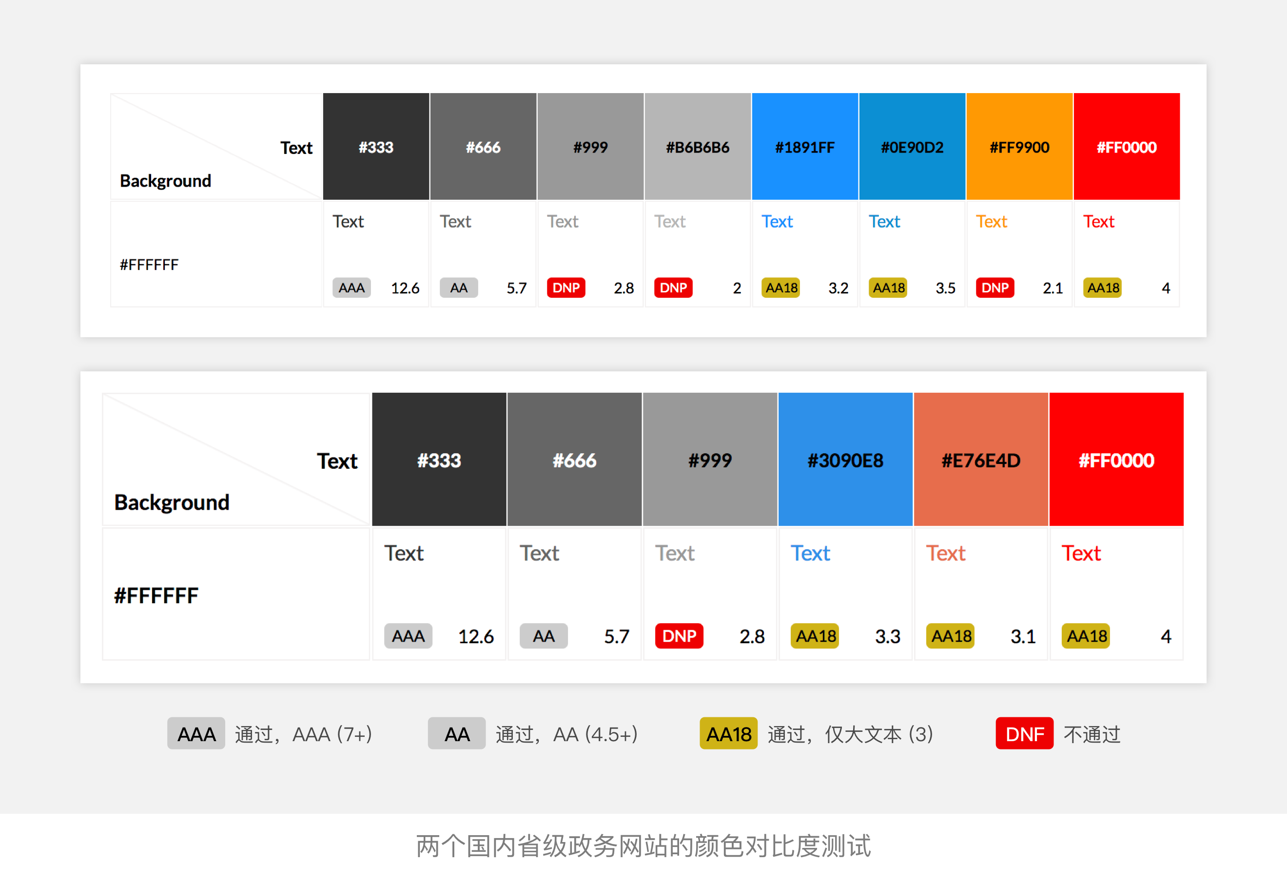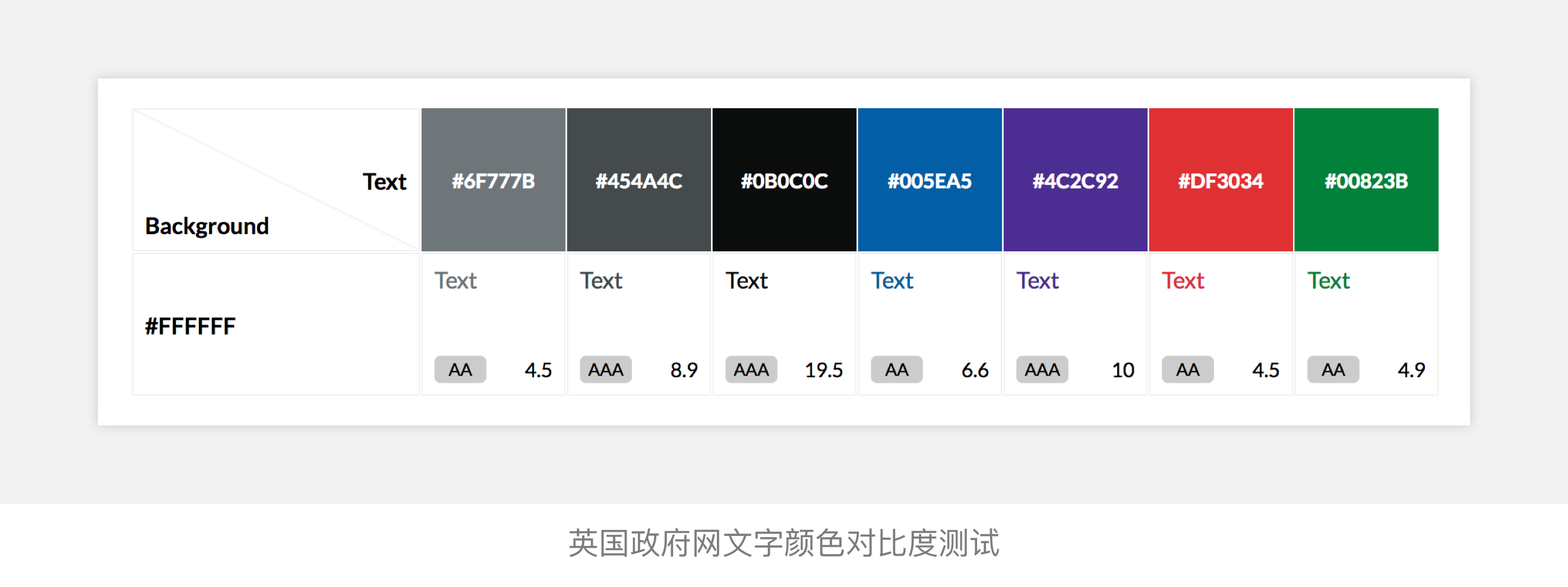 在附屬內(nèi)容中,未激活的界面組件、純粹的裝飾、文本作為標(biāo)志或品牌名稱的一部分,這些情況都沒(méi)有最低對(duì)比度限制。 WebAIM 可以幫助我們測(cè)試對(duì)比度,并且可以在線調(diào)整符合標(biāo)準(zhǔn)的顏色Contrast Grid 可以測(cè)試多個(gè)顏色組合是否符合 WCAG 2.0 的對(duì)比度標(biāo)準(zhǔn)使用 Contrast Grid 測(cè)試了兩個(gè)國(guó)內(nèi)省級(jí)政務(wù)服務(wù) 網(wǎng)站的顏色,發(fā)現(xiàn)基本上只有主要文字和次要文字的顏色能達(dá)到標(biāo)準(zhǔn),用于網(wǎng)站上大面積的品牌藍(lán)色(鏈接色)在大于 18px 字號(hào)下才符合對(duì)比度要求。英國(guó)政府網(wǎng)是目前全球數(shù)字政府中做的最好的政務(wù)網(wǎng)站,在英國(guó),政務(wù)服務(wù)是所有服務(wù)里面使用時(shí)間最久、提供量最大的服務(wù)。他們網(wǎng)站設(shè)計(jì)也很注重信息無(wú)障礙,在這方面付出了很大的努力。檢測(cè)后發(fā)現(xiàn)英國(guó)政府網(wǎng)使用的顏色都有足夠高的對(duì)比度,滿足了 WCAG 2.0 的標(biāo)準(zhǔn),而且整體顏色都使用了偏低飽和度和明度的顏色。加強(qiáng)顏色的對(duì)比度,不只是為了讓低視力人士能更好地使用我們的產(chǎn)品,同時(shí)也可以讓使用較差顯示設(shè)備的用戶、老年人有更好的產(chǎn)品體驗(yàn)。