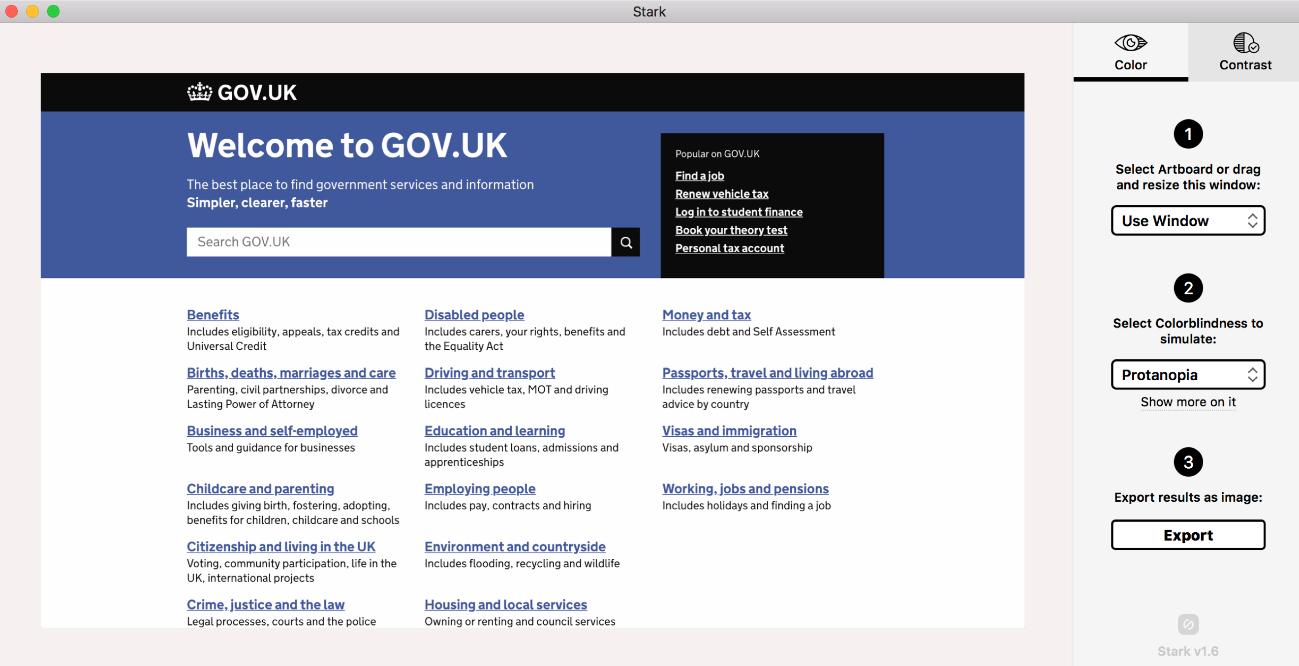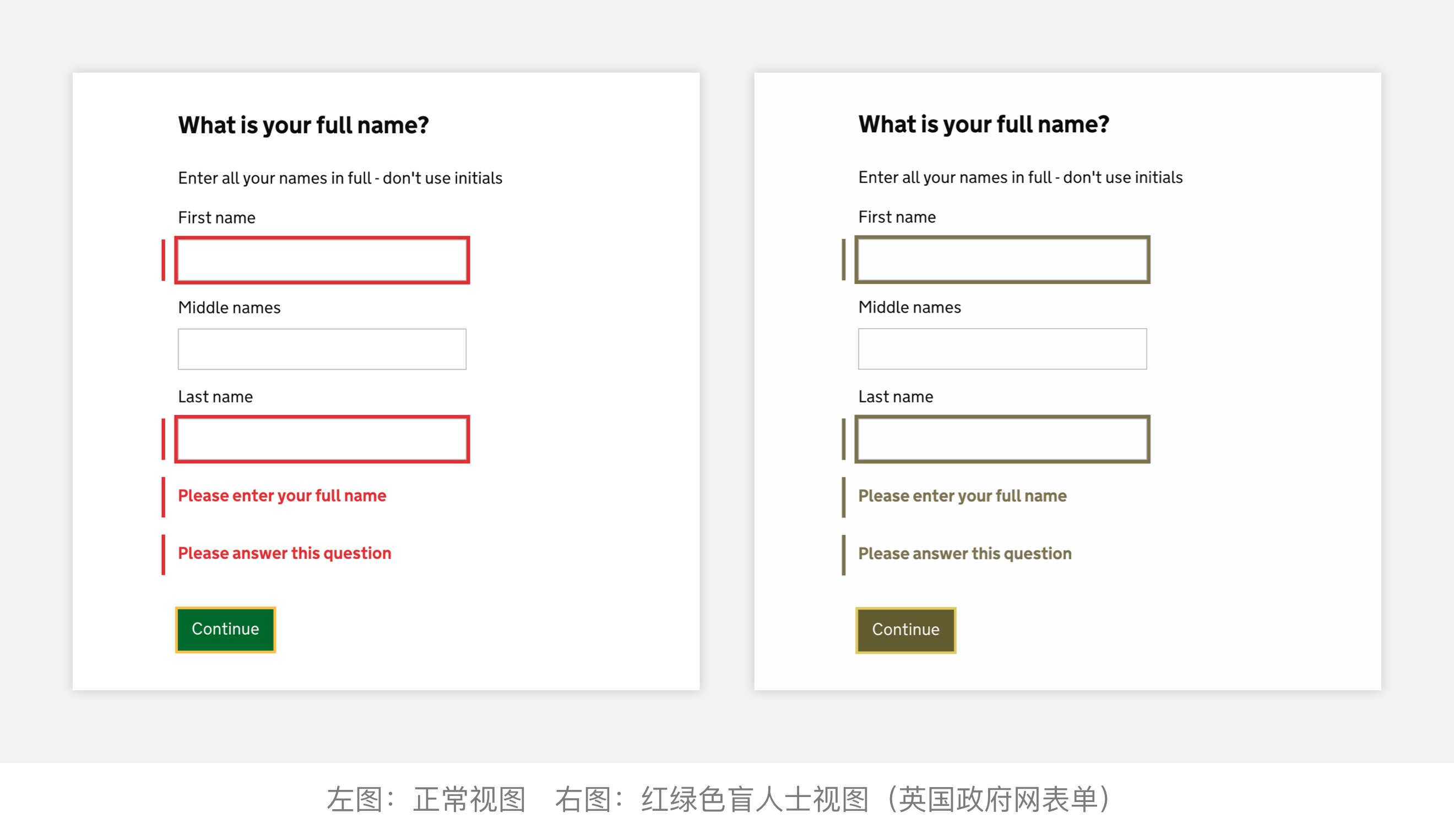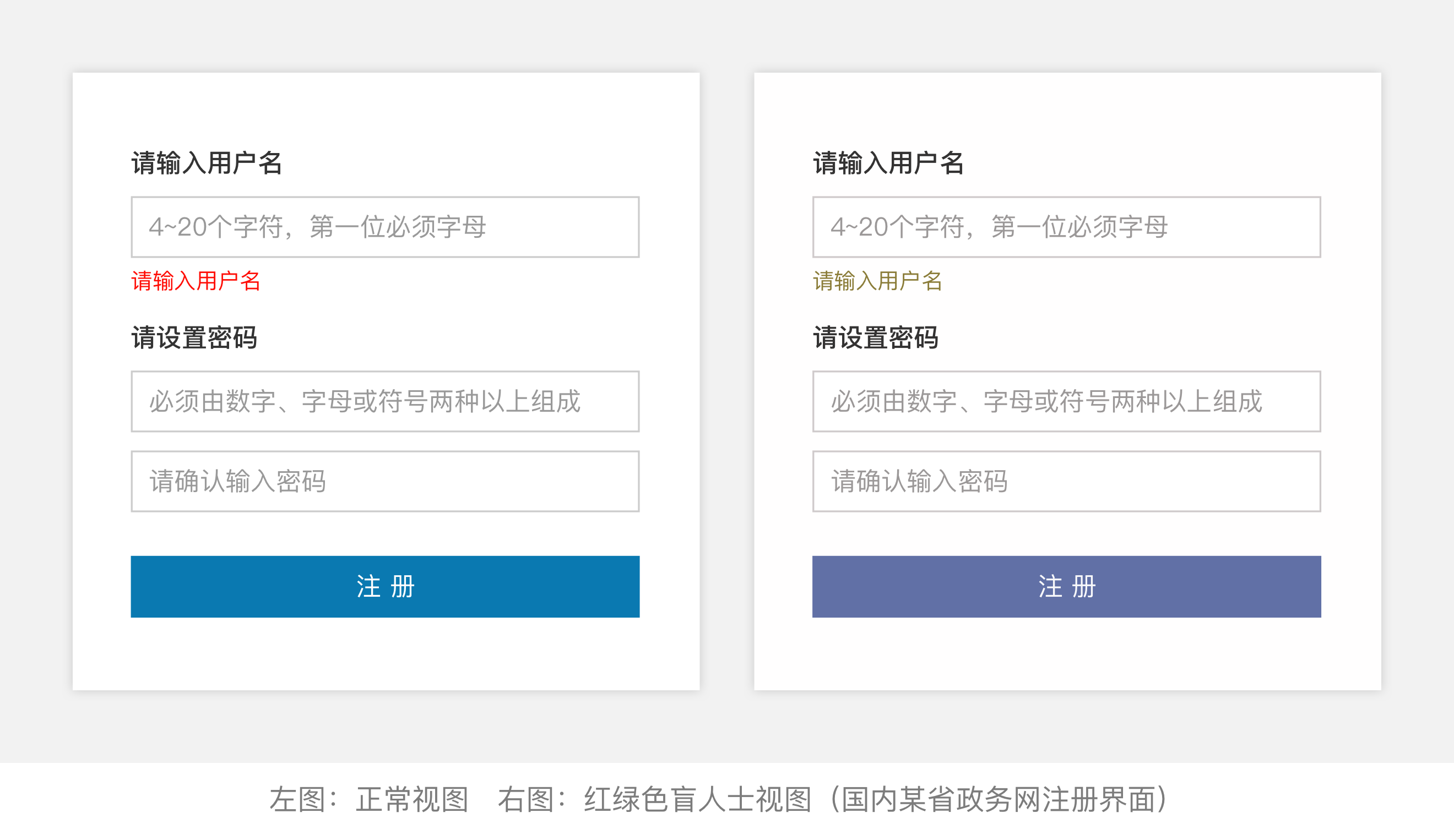 顏色在設(shè)計(jì)中起著重要作用,能喚起情感,感受和想法,并且可以幫助增強(qiáng)品牌的信息和感知。然而,當(dāng)用戶無(wú)法看到它們或以不同方式感知它們時(shí),顏色的作用就會(huì)消失。對(duì)于無(wú)法辨別顏色的色盲色弱人士,如果只用顏色作為傳達(dá)信息,提示信息重要性或區(qū)分視覺(jué)元素的唯一途徑,他們是很難感知的。 Stark(Sketch插件)可以模擬不同類型的色盲色弱人士所看到的效果,來(lái)幫助我們?cè)O(shè)計(jì)某個(gè)政務(wù)網(wǎng)站上的注冊(cè)表單,在沒(méi)有填寫任何信息的情況下點(diǎn)擊注冊(cè)按鈕,必填項(xiàng)出現(xiàn)的錯(cuò)誤提示是在下方用了紅色的文字,這種方式對(duì)于普通用戶來(lái)說(shuō)是可以感知的。右側(cè)圖則是模擬紅綠色盲人士看到的效果,這種情況下,錯(cuò)誤提示的引導(dǎo)性就會(huì)降低很多。英國(guó)政府網(wǎng)的錯(cuò)誤提示對(duì)于色盲色弱人士就友好很多,除了紅色的提示文字外,輸入框的邊框還會(huì)加粗處理,并且加上豎線提示對(duì)應(yīng)沒(méi)填寫的表單項(xiàng),提醒用戶注意。除此之外,其實(shí)還有很多視覺(jué)處理的方法來(lái)達(dá)到傳遞信息的目的,例如在輸入框內(nèi)或者提示文字前加上感嘆號(hào)的圖標(biāo),這種方式對(duì)于普通用戶來(lái)說(shuō),也會(huì)有更明確的提示。