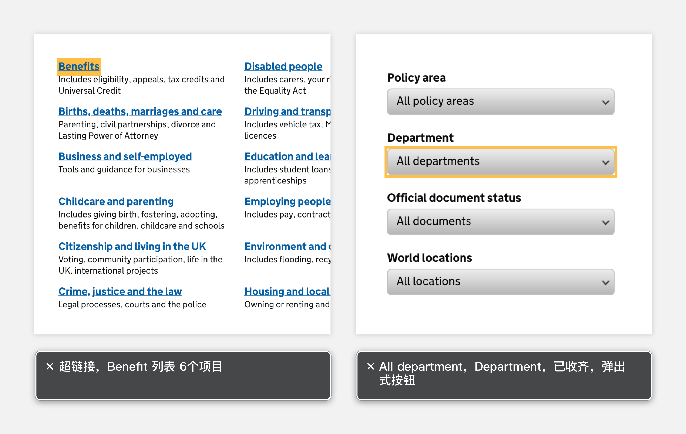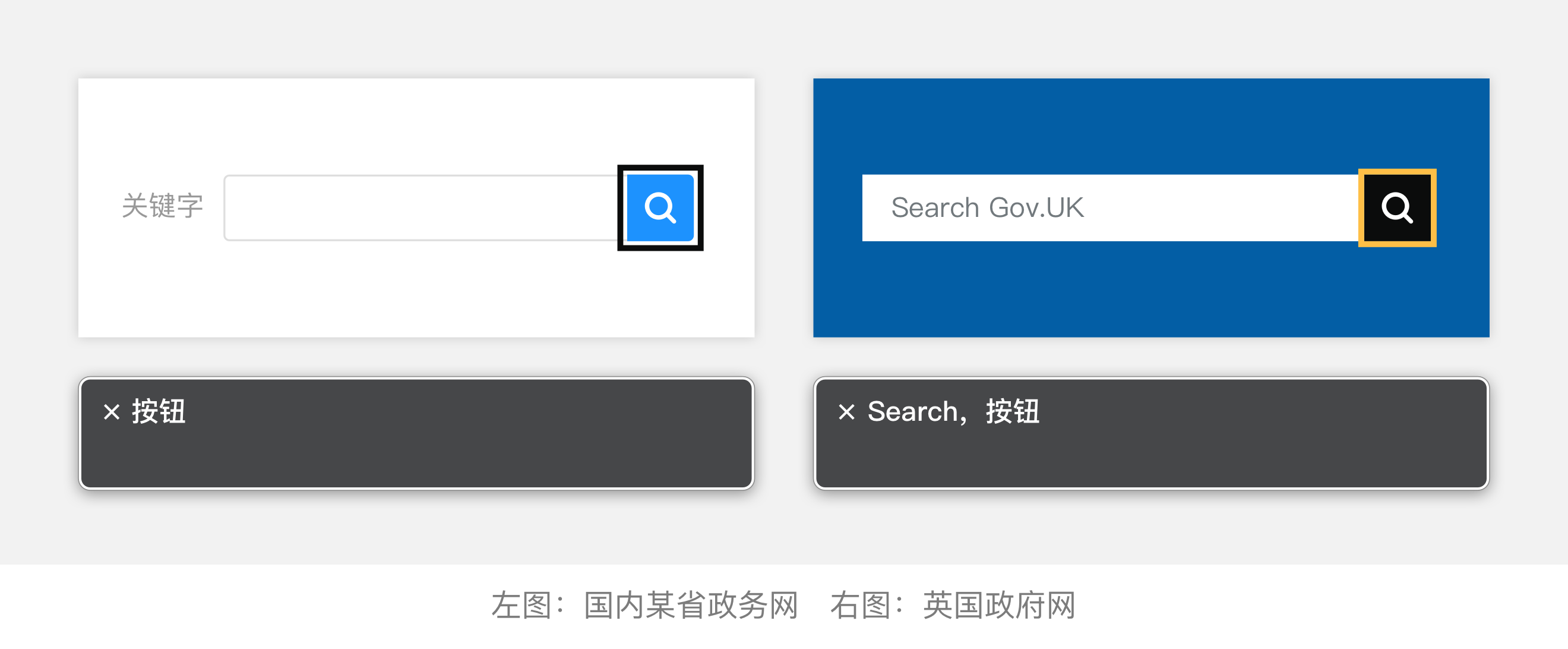視障人士經(jīng)常會(huì)利用屏幕閱讀器來(lái)“聆聽(tīng)”我們的網(wǎng)站,網(wǎng)站上的文字、圖片、組件等信息都是通過(guò)屏幕閱讀器說(shuō)出來(lái)。這時(shí)候如何為這些非文本內(nèi)容添加描述準(zhǔn)確的輔助替代文本就非常重要。 以下圖為例,左圖搜索框按鈕的替代文本為“按鈕”,這種描述就會(huì)很抽象,增加了視障人士的理解門檻,容易讓他們產(chǎn)生一個(gè)疑問(wèn):這是一個(gè)什么作用的按鈕?相對(duì)來(lái)說(shuō),右圖的處理則清晰很多,按鈕的替代文本很明確地告訴用戶這是一個(gè)搜索按鈕。圖片很多時(shí)候在設(shè)計(jì)中用于傳達(dá)特定的感覺(jué)和渲染氛圍,如果需要通過(guò)用替代本文來(lái)傳達(dá)圖片信息的時(shí)候,我們可以嘗試用簡(jiǎn)練的語(yǔ)言去描述圖片內(nèi)容,讓視障人士能快速獲取信息,在腦海里形成畫(huà)面,而不只是告訴他們這是一張圖片。 如果我們沒(méi)有對(duì)圖片添加替代文本,屏幕閱讀器就會(huì)直接把一串字符的文件名字讀出來(lái)。嘗試打開(kāi)屏幕閱讀器,閉上眼睛去“聽(tīng)”這種圖片,是一種非常難受的體驗(yàn)。除此之外,英國(guó)政府網(wǎng)還有很多細(xì)節(jié)的處理值得學(xué)習(xí)。他們添加的標(biāo)簽描述都很清晰,焦點(diǎn)切換到列表的第一項(xiàng)時(shí)會(huì)告訴用戶這個(gè)列表總共有多少個(gè)項(xiàng)目,下拉菜單目前是一個(gè)怎樣的狀態(tài),讓視障人士對(duì)于整個(gè)網(wǎng)站有一個(gè)布局感受,同時(shí)也大大提高了他們安全感。