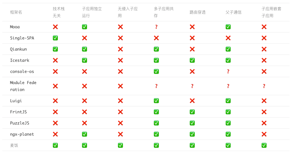 除了webpack的聯(lián)邦模塊方案需要結(jié)合構(gòu)建來做,比較特殊外,其他方案都是在運行時完成應(yīng)用聚合。 “子應(yīng)用獨立運行”指子應(yīng)用不需要放到基座應(yīng)用這個大環(huán)境下就能自己跑,便于調(diào)試和被不同基座引入。 “子應(yīng)用嵌套子應(yīng)用”是一個比較特殊的點,目前市面上能做到的框架不多。